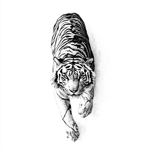tigers full body realistic sketch, white background, black and white, high contrast, the tigers body it seen from an overhead view, walking tiger, the tigers body is curved