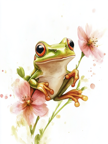 soft dreamy watercolor of a beautiful representation of a adorable happy green frog on its feet, with a radiant shine and bright eyes, some pink flowers, white background --ar 3:4 --v 6.1