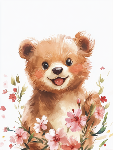 soft dreamy watercolor of a beautiful representation of a adorable happy brown bear, with a radiant shine and bright eyes, some pink flowers, white background --ar 3:4 --v 6.1
