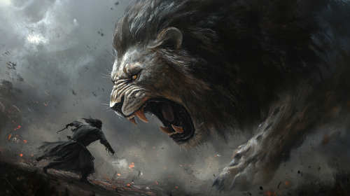 The deafening roar of the lion mixed with the sound of his footsteps as he sought any opening to attack while dodging the lion’s sharp claws and teeth. --ar 16:9