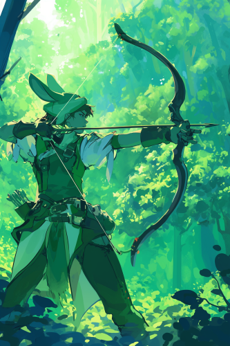 A rabbit archer, wearing green and white hunter gear, readying a shot with his bow, lush green forest in background, Dan Mumford --niji 6 --ar 2:3 --s 50