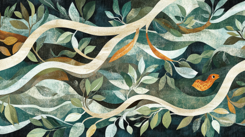 A carpet pattern showcasing a mangrove forest in an abstract style, featuring overlapping roots, leaves, and water lines in a seamless design. Mangrove trees are arranged in a flowing pattern, with tropical animals like iguanas, fish, and small birds subtly integrated into the scene. The colors are muted greens, earthy browns, and soft aquas, creating a soothing, organic feel suitable for a nature-inspired space --ar 16:9