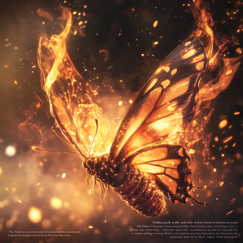 "Create a poetic and cinematic scene featuring a chrysalis engulfed in soft, glowing flames. The flames illuminate the intricate details of the chrysalis as it transforms into a butterfly. Capture the delicate emergence of butterfly wings from the fiery cocoon, symbolizing rebirth and freedom. The background should be an ethereal landscape with warm, dreamy colors blending harmoniously, enhancing the magical atmosphere. Add subtle sparks and embers drifting in the air, evoking a sense of wonder and transformation." Feel free to adjust any part of it to better fit your vision!