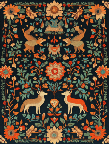 A naive art-inspired carpet design where wild animals such as wolves, birds, and deer are placed in the center, with a simple, almost childlike rendering. They are framed by a ring of flowers, leaves, and stylized vines, drawn in a vibrant folk-art style. The colors are bold and cheerful, with deep greens, bright blues, and warm oranges creating a lively, handcrafted appearance --ar 3:4