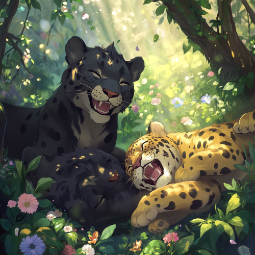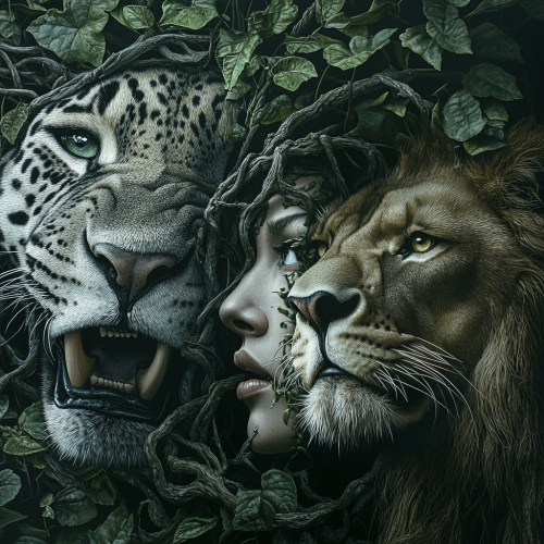 from the front in hyperrealistic a jaugar on the left and a lion on the right in the jungle next to a woman make out of vines. she is trapped in the jungle and the jaguar is chewing on the vines. the lion is also chewing in the vines which bind her. they free her. she has teeth and hints of a black jaguar in her face and cheeks with whiskers.