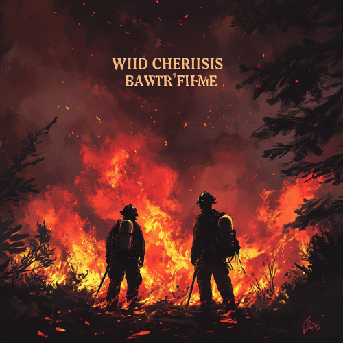 Design an evocative podcast cover for 'Wildfire Chronicles: Heroism Beyond the Flames.' Feature a lone firefighter silhouette standing resiliently, holding a hose, framed by a blazing wildfire with deep red and orange hues. The background should have dark, smoky clouds to create depth and atmosphere. Place the title 'Wildfire Chronicles' in bold text at the top, with the subtitle 'Heroism Beyond the Flames' in smaller font below. Ensure text color contrasts sharply in white or light gray. Include a subtle brand or logo in one of the corners.