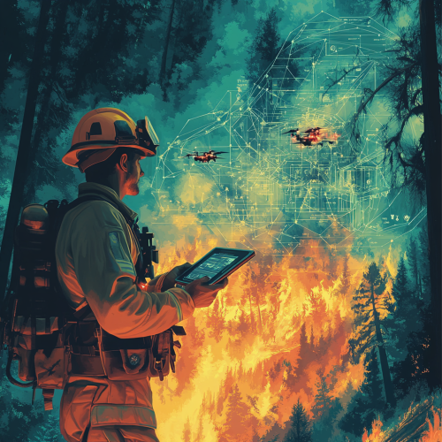 Design a podcast cover for 'Wildfire Chronicles: Heroism Beyond the Flames' that highlights innovation in wildfire management. Show a firefighter interacting with advanced technology like drones or a digital control tablet, while in the background, a stylized depiction of data visualizations overlays a forest. The image should evoke progress and strategy, using shades of blue, green, and soft amber. Place the podcast title in bold at the top