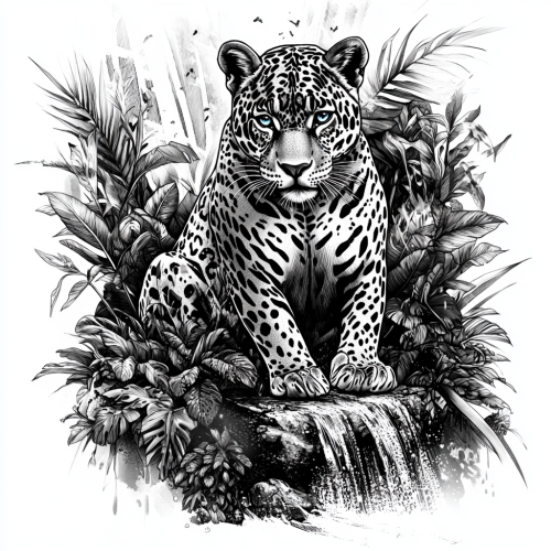 "A highly detailed black-and-white tattoo design featuring a majestic jaguar in its natural habitat. The jaguar sits in a crouched position, muscles tense and ready to spring, with piercing blue eyes that stand out against the monochrome design. Its fur is intricately detailed, showcasing the jaguar's signature rosettes. Surrounding the jaguar, elements of its jungle environment come to life--dense tropical leaves, vines, and the faint outline of a waterfall in the background. The ground beneath the jaguar features rocks and lush foliage, while beams of light filter through the canopy above, creating subtle contrasts of shadow and light. The design wraps around the arm, following the natural flow of the jaguar’s movements, making it appear dynamic and alive.