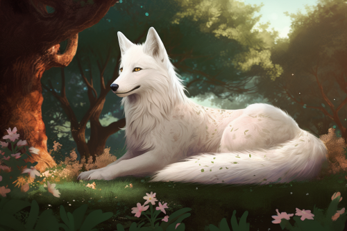 In the royal palace gardens of Eivisa, an elegant, mystical wolf-like creature named Baliza lies calmly on a soft patch of grass beneath a tree. Her coat has a subtle magical shimmer, giving her an ethereal aura. In front of her, Rosa, a small, playful weasel-like creature with bright, curious eyes, scampers joyfully, exploring the vibrant surroundings. The background showcases the manicured palace gardens with blooming flowers, tall sculpted hedges, and hints of the palace walls. Soft sunlight filters through the trees, casting a warm, golden glow, emphasizing the serene companionship between the two familiars in this peaceful scene. --v 5.0 --ar 3:2