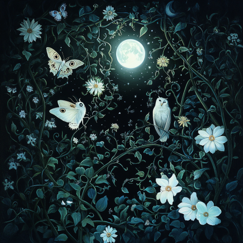 Illustrate a mystical night garden, where moths and owls flutter among delicate vines of ivy and moonflowers. The garden is illuminated by soft moonlight, which casts an ethereal glow, reflecting off the detailed wings and petals