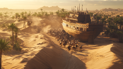 drone shot of the prophe Noah and his family, and the animal entering the Ark, the ark is enormous set in the desert of the mid east, there are palm trees and sand hills in the back ground, realistic, 4k, --ar 16:9