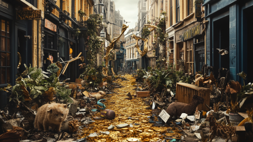 a photorealistic image from a moviea surreal twist vision of a post war london soho. The streets are paved with gold and the street furniture as turned into plants. The buildings are made of flora and fauna and the animals are made of trash --ar 16:9