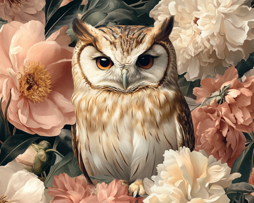 This image features an adorable penguin nestled among a lush assortment of large, blooming flowers. The penguin, with its sleek black and white feathers and small, round body, takes center stage in the scene. Its bright, curious eyes and small beak give it an endearing, playful expression that adds charm to the composition. The background remains the same, with richly detailed flowers surrounding the penguin. Large, soft petals in shades of peach, cream, and pink provide a sense of depth and natural beauty. Lush green leaves and delicate branches complement the flowers, creating a vibrant, harmonious setting, while smaller buds and blossoms add further texture and liveliness to the arrangement. The combination of the charming penguin and the blooming flowers creates a peaceful, nature-inspired scene. The soft color palette and intricate details in the flowers and foliage evoke a sense of warmth and tranquility, making this image perfect for a relaxing and delightful v 4 --ar 5:4
