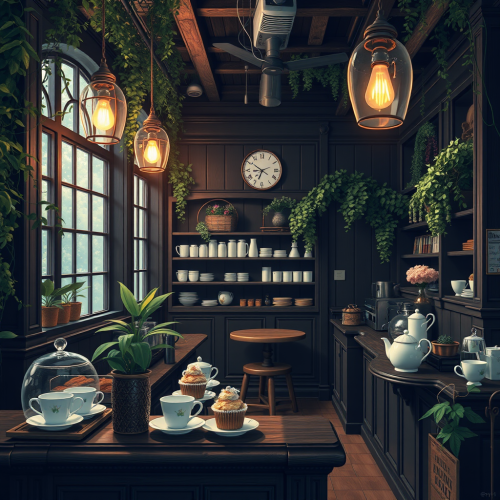 a large orange cat, victim of a curse, sitting on a desk, surrounded by maps
