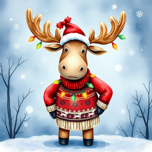 A mechanical robot (Bender from Futurama by Matt Groening) transformed into a robotic reindeer with metallic antlers and a glowing red nose, wearing a red harness adorned with jingle bells. It pulls a futuristic sleigh inspired by Santa's sleigh. At the front of the sleigh, a young man dressed as Santa ( Fry from Futurama) holds the reins with a smile. At the back, a woman with purple hair sits, visibly afraid of the height. In the background, a clumsy alien (Zoidberg from Futurama) has fallen from the sleigh, with gifts floating in the air around him. The scene is energetic and futuristic, in a modern cartoon style with bright colors and a high-tech universe. Futurama style by Matt Groening
