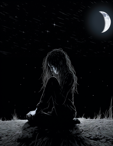 full body portrait, girl crying, sitting under a night sky, art by Apollonia Saintclair::3 --style raw --ar 216:279 --s 250