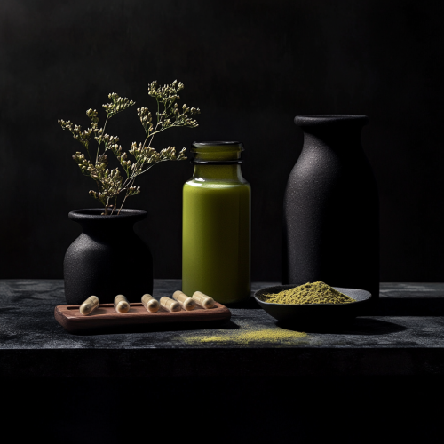Professional photographer documentary herbal supplement and matcha Teiced a hyper Realistic 16k, hyper quality, Photorealism, Food photography Food, hyper reality, documentary. on a table, shot with a flash photography , Black theme, black back ground, as seen on designer brand photoshoot.