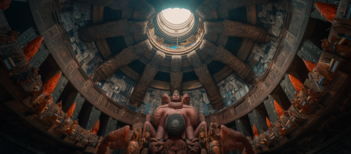 Buddhist heaven dome, bottom view, buddhist gods characters are vividly lined ranked as rows, surrounding to the far end circling to the middle, Unreal Engine 5, Cinematic, Ultra-Wide Angle, Depth of Field, hyper-detailed, insane details, intricate details, beautifully color graded, Unreal Engine, Cinematic, Photoshoot, Shot on 25mm lens, Depth of Field, DOF, Tilt Blur, Shutter Speed 1/1000, F/22, White Balance, 32k, Super-Resolution, Megapixel, Pro Photo RGB, VR, Lonely, Good, Massive, Half rear Lighting, Backlight, Natural Lighting, Incandescent, Optical Fiber, Moody Lighting, Cinematic Lighting, Studio Lighting, Soft Lighting, Volumetric, Beautiful Lighting, Accent Lighting, Global Illumination, Screen Space Global Illumination, Ray Tracing Global Illumination, Optics, Scattering, Glowing, Shadows, Rough, Shimmering, Ray Tracing Reflections, Lumen Reflections, Screen Space Reflections, Diffraction Grading, Chromatic Aberration, GB Displacement, Scan Lines, Ray Traced, Ray Tracsing Ambient Occlusion, Anti-Aliasing, FKAA, TXAA, RTX, SSAO, Shaders, OpenGL-Shaders, GLSL-Shaders, Post Processing, Post-Production, Cell Shading, Tone Mapping, CGI, VFX, SFX, insanely detailed and intricate, hyper maximalist, elegant, super detailed, dynamic pose, photography, volumetric, ultra-detailed, intricate details, 8K, super detailed, ambient occlusion, volumetric lighting, high contrast, HDR --ar 16:7 --v 5.0