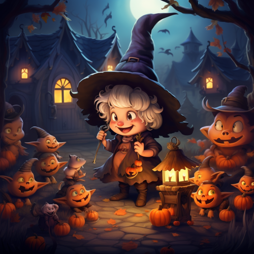 cute chubby good old cartoon witch outside her cottage, with her cauldron, giving candy to children on halloween