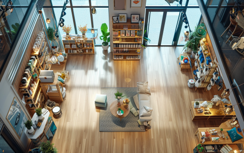 matched two photography in a hyperrealistic interior model store photography, top angle view, 3D style, CGI, 4k, Animation, --ar 16:10 --v 6.0