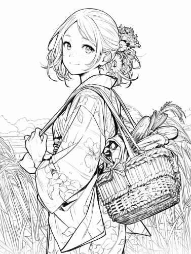 Explorecoloring book, kimono girl with a smile, As a coloring book, white and black color, borders should be simple, clear, distinct, and thick lines, near a rice field, holding a basket of vegetables, from a rear view, --ar 3:4 --s 250 --niji 6