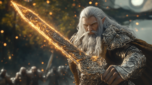 Wood Elf King wielding a Holy Sword surrounded with a magical glowing aura, wearing a shiny armor and shield ornate with silver and emeralds crest, long silver hairs sophisticate braids, leading his elven army fighting against orcs army, Magical forest skyline background, photorealistic, epic dynamic heroic action pose, epic cinematic composition, soft natural color grading, soft volumetric lighting --ar 16:9 --v 6.1