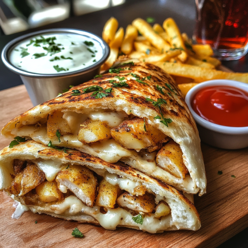 ExploreTacos galette thin press grilled , filled with chicken pieces, fried potatoes, and white cheese sauce. The sandwich is cut in half, served with ketchup and mayonnaise sauces on the side, along with fries and Coca-Cola.