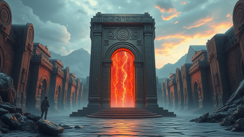 From a low angle behind the man, he walks up a straight, endless staircase set into the mountain, with the steps disappearing into the distant sky. The rugged terrain around him adds to the sense of challenge. The sun is low, creating a silhouette effect and harsh lighting on the steps, hd quality, realistic textures and shadows --ar 16:9 --v 6.0