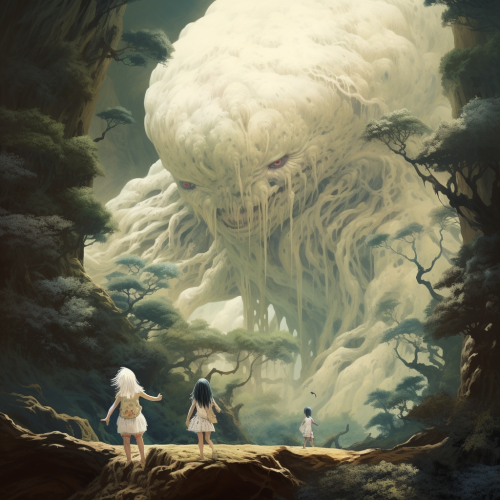 A giant in a magical forest looming over a little girl wear cream color dress, detailed fantasy painting
