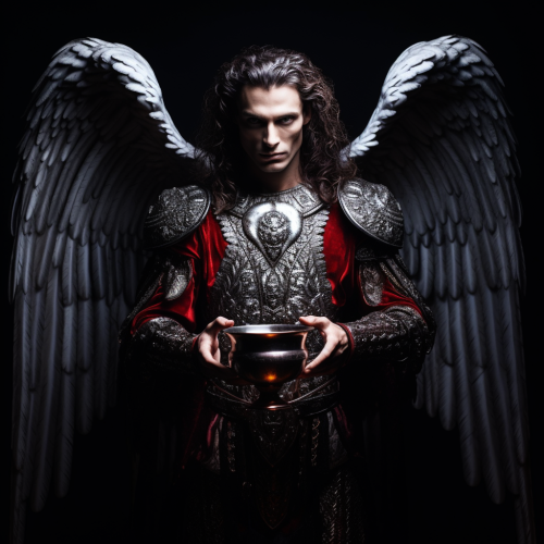 a masculine angel, in the act of pouring liquid from one holy grail to another holy grail, stading upright, looking towards camera black background, hints of red,