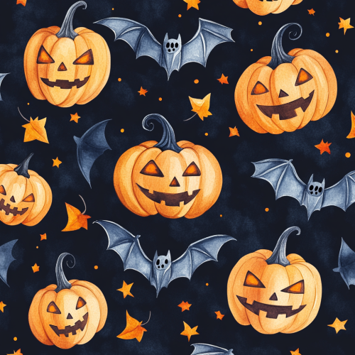 Eerie Jack-o'-lanterns and bats seamless pattern, flat illustration, Watercolor, vector, seamless colorful pattern, repeating tiled patterns design, cute and quirky, isometric style.
