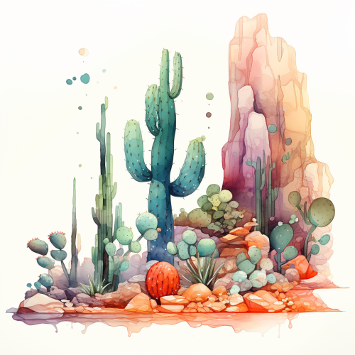 Decompose, elements single, set, Alcohol ink, minimalist abstract Watercolor pattern of desert rocks and plants cactus hq, hi quality, more details, 16k, 300 dpi --s 250