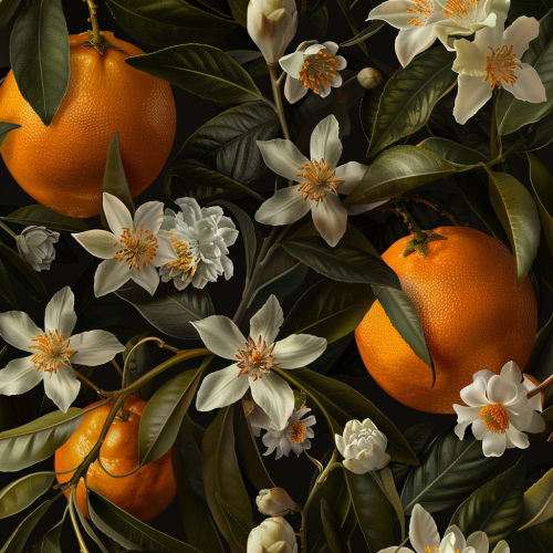 A vintage style, classic and royal desktop wallpaper, Mandarin fruit and neroli flowers are the main elements,intricate details, hyper realistic, nostalgic imagery. --v 6.0
