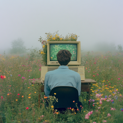 Photo of an old beige computer with flowers growing out of it. On top is the screen, which shows a green background. In front, sitting at his desk, is a young man wearing a blue shirt and black pants. He has short hair, and the field around him is full of colorful wildflowers. The weather is foggy, and the shot is wide. The image has a Kodak film photography aesthetic, with a dreamy atmosphere, nostalgic mood, pastel colors, and a grain effect.