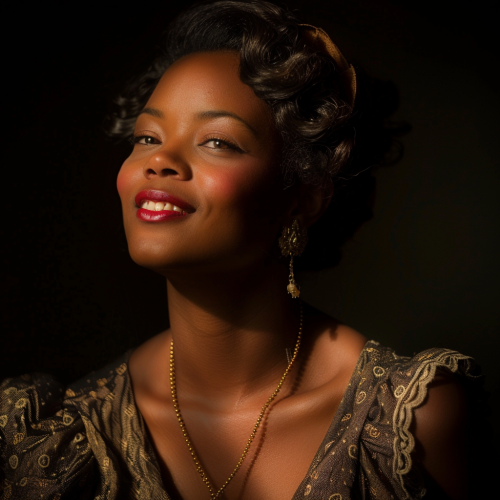 Portrait of black woman in 30s wearing expensive 1940s dress. She has a warm smile. Vintage, dramatic lighting, deep shadows, dangerous mood, detailed facial features, dynamic pose, realistic, blank background --v 6.0