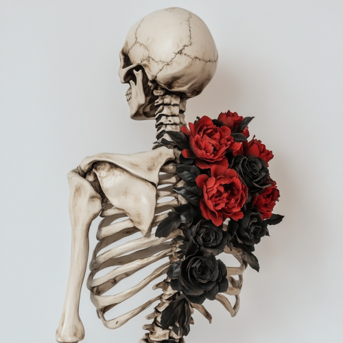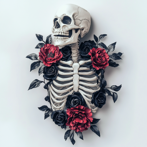 a skeleton torso and spine without head on a white background. The torso has intertwined with both red peonies and black roses, vintage look, fish eye effect, bohemian look, muted color, fantasy. Faded image, hyper realistic, beautiful light.