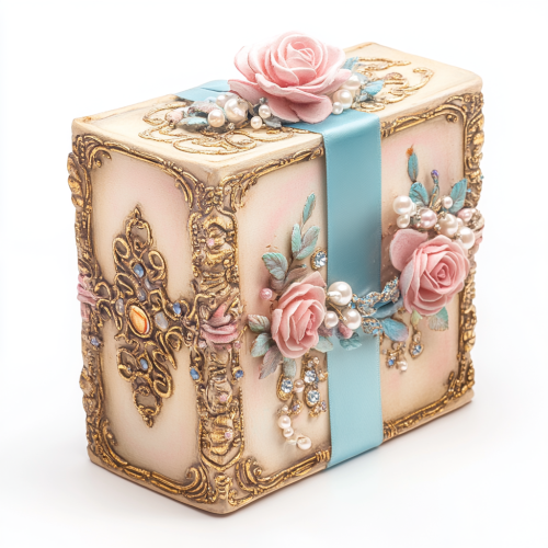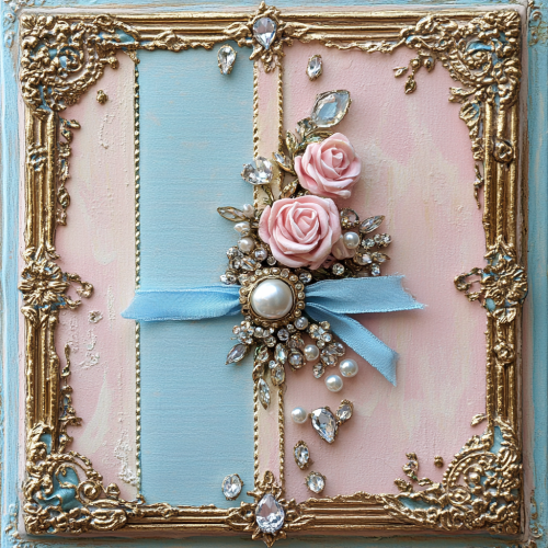 Beautiful vintage book with roses and blue ribbon, adorned with gold filigree, detailed whimsical Rococo elements, pearls and jewels, pastel pink and baby blue color palette, isolated on a white background, highly realistic photography, focus stacking.