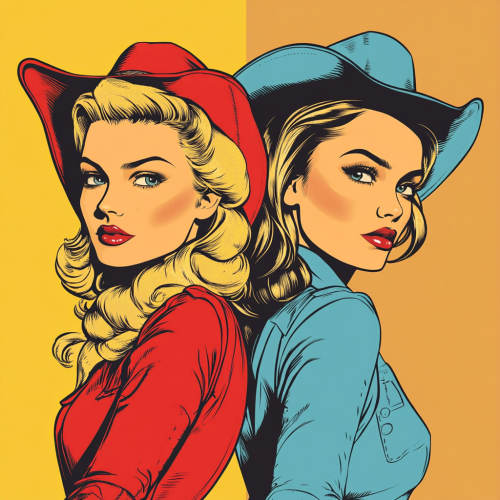 portrait of a blonde and brunette woman, in the style of 1940's comics. wearing western attire, cowboy inspiration, simplified colors. bold outline, simplified colors, cmyk