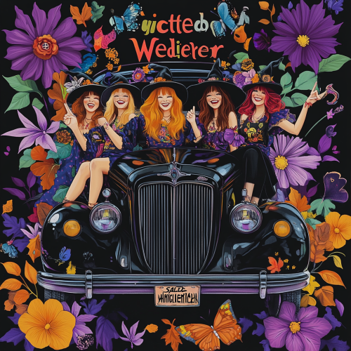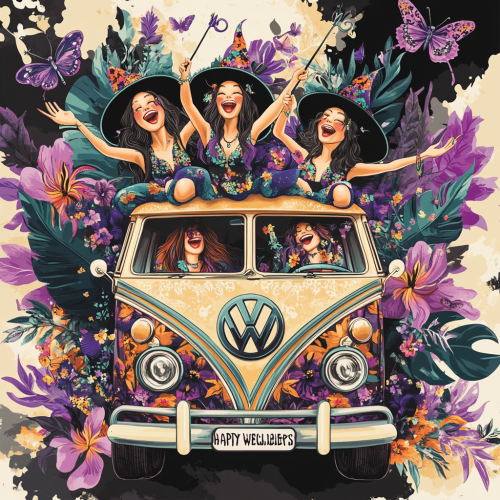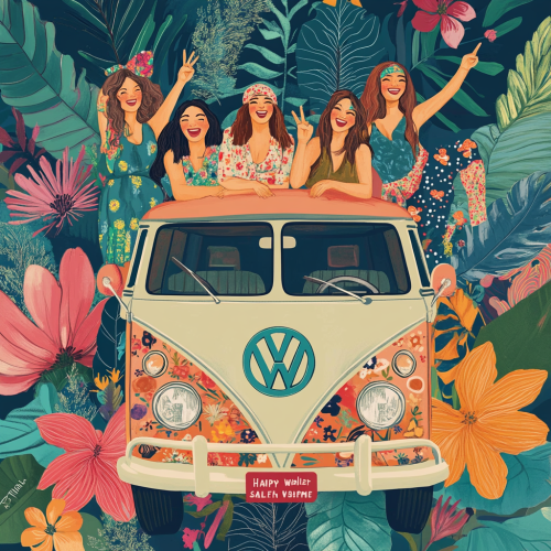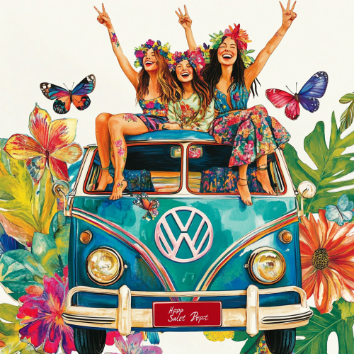 \>A vibrant, retro-style illustration of four bohemian women sitting on top of a colorful vintage VW van, surrounded by large, colorful flowers and butterflies. The women wear hippie-inspired outfits with headbands, flowing tops, and long hair, laughing and throwing peace signs. The van is decorated with floral patterns and has a vintage feel. At the top, bold text reads ‘Happy Wednesday.’ The front rectangle license plate is centered and has text with ‘Salted Cherry’ in a cherry red color that stands out. Background includes tropical leaves and whimsical details. Bright, cheerful, and detailed artwork with a joyful, free-spirited vibe.