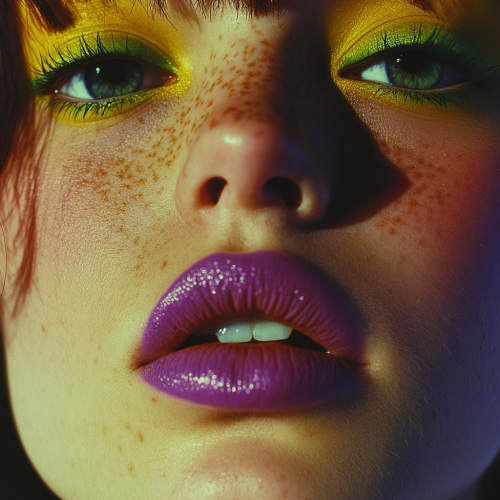Close-up of a model with bold yellow eyeliner, purple lipstick and green eyeshadow, in the style of a vintage David LaChapelle fashion shoot. The close-up focuses on the face, with bright colors and a soft, dreamy, surreal atmosphere reminiscent of Kodak film.