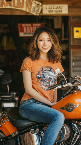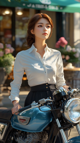 A young Japanese woman in a fitted white blouse and a stylish black skirt poses gracefully on a classic blue Honda CB750. Her hair is elegantly pulled back in an updo, and she exudes confidence and poise. The bike is parked in front of a charming café, with flowers and outdoor seating in the background, creating a vibrant and inviting atmosphere that highlights both her beauty and the bike's vintage appeal. Photorealistic, ultra-detailed with café backdrop, 8K resolution --ar 9:16 --v 6.1 --style raw