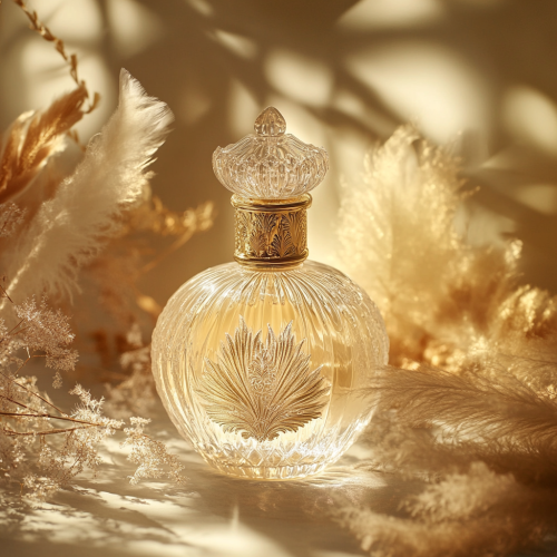 Vintage-inspired luxury perfume bottle, subtle opulence, golden embossed cap, surrounded by airy feathers and sunlight, nostalgia-filled classic aesthetic, warm tones, regal but approachable, for a sophisticated audience.