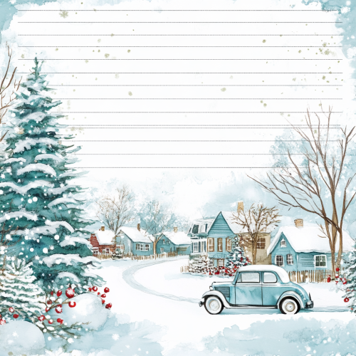 Create a sheet of lined stationery on stark white paper. Lines centered and evenly spaced horizontally. Create a small corner border of Alcohol ink splashes in light blue, pale silver and white, whimsical Christmas winter wonderland with 1920’s vintage car sitting in a charming neighborhood. Place small corner border at the very bottom edge righthand corner of each stationery sheet.