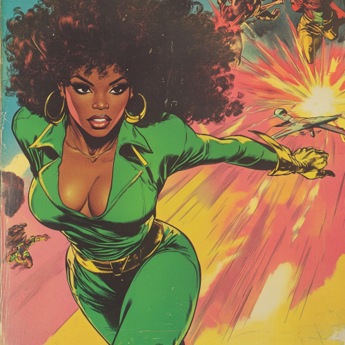 she’s wearing a purple cape and standing like a hero, 70’s aesthetic, orange knit body suit, Wes Anderson style photo, expired film --ar 5:7 --stylize 678 --v 6.1