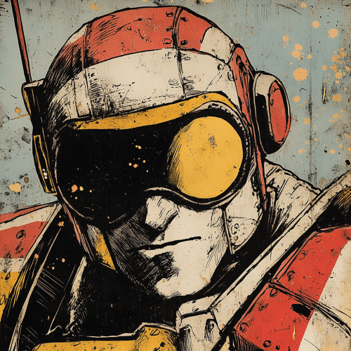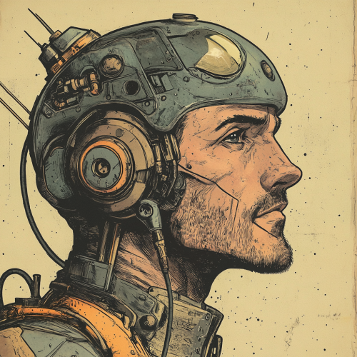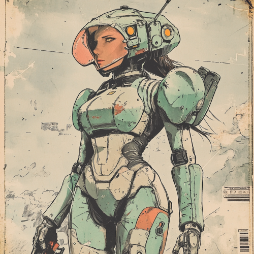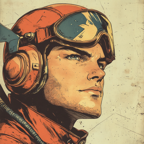 Vintage colored comic of a good looking male hero mecha pilot full person, The artwork is characterized by a half - dotted ink technique, reminiscent of vintage comic books, giving the image a textured, grainy appearance, so it's exactly like looking old printed
