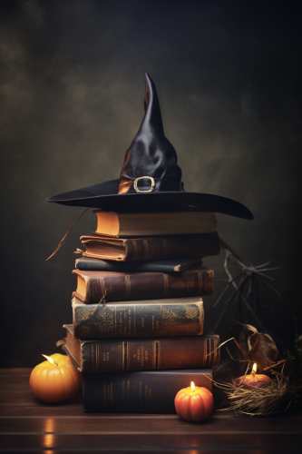 witch hat on a stack of books, candle in the background, dark academia, very dark, low light, muted color, spooky atmosphere, halloween, vintage oil painting style with soft brushstrokes --ar 2:3 --v 5.2