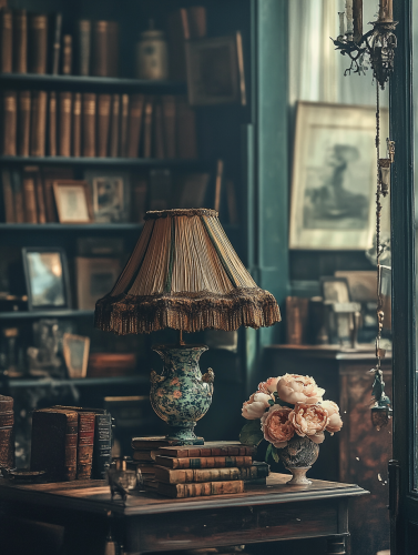 A incredibly stunning vintage room , a table adorned with an eclectic mix of antique items – a interesting porcelain lamp with a gold velvet shade adorned with beautiful trims of fringe, a ceramic vase with pink peonies, a stack of worn leather-bound books, Background layered with worn bookshelves and richly patterned fabrics, and various antiquities, beams of sunlight filtering through a nearby window, illuminating dust particles in the air. Detailed textures, maximalism, warm tones, storytelling, editorial, inviting, nostalgic --ar 3:4 --personalize mxpr84z --stylize 300 --v 6.1