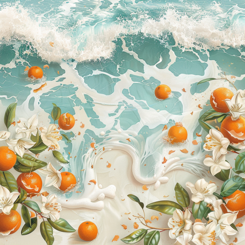 A vintage style, classic and royal desktop wallpaper, Mandarin fruit and neroli flowers are the main elements,spread on white ocean sand,azure waters splashing, intricate details, hyper realistic, nostalgic imagery. --v 6.0