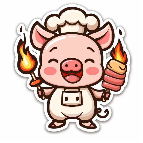 a sticker logo of cute pig wearing chef hat, pretty, white background,hold a pork satay in 3D behind it, very attractive and with fire colors and black --s 250 --v 6.0