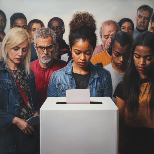 hyperrealistic photo, Diverse People: Show a diverse group of people in action, such as casting their votes, engaging in discussions, or looking thoughtful as they consider issues that matter to them. This conveys inclusivity and the personal aspect of voting. Voting Symbolism: Integrate common voting symbols such as a ballot box, a checkmark, or a voting sticker. These instantly communicate the voting theme. • Soft, Positive Colors: Use bright, positive colors like blue, red , to evoke a sense of optimism and empowerment. Avoid overly harsh tones, keeping the design approachable and friendly.